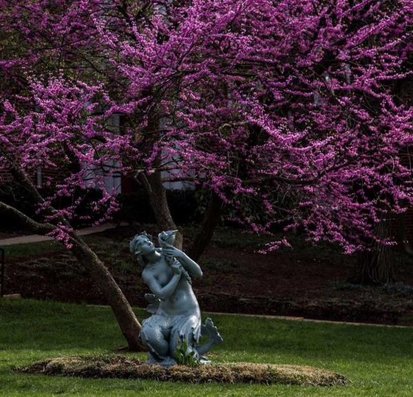 Spring is gorgeous in the purple blossoms of the Red Bud Tree. The mermaid sits below, enjoying the mysterious flowers as she longs for the deep green sea. This photo was taken by Maureen Spagnolo, outside her home in Washington, D.C.