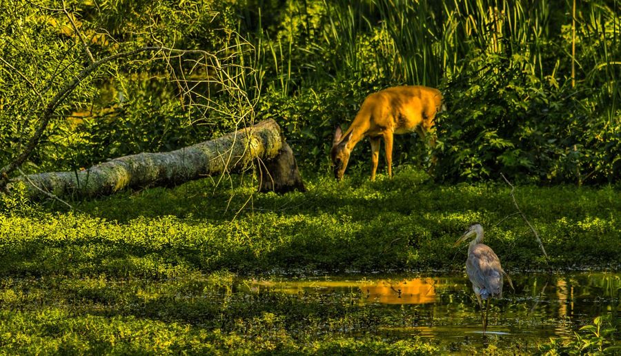 I was walking in Huntley Meadows Park, in Fairfax, Virginia, and saw a deer across the stream, grazing, illuminated by the afternoon sun. I stopped to take a photo. There was a flutter of wings, and a large heron landed close to the deer, and seemed to be greeting him by beating his wings. As I watched, I understood them to be friends. It was a joyful sight. Huntley Meadows Park, the largest park operated by the Fairfax County Park Authority, is located in the Hybla Valley area of Fairfax County, Virginia, south of the city of Alexandria. (Maureen Spagnolo) Click for larger image.